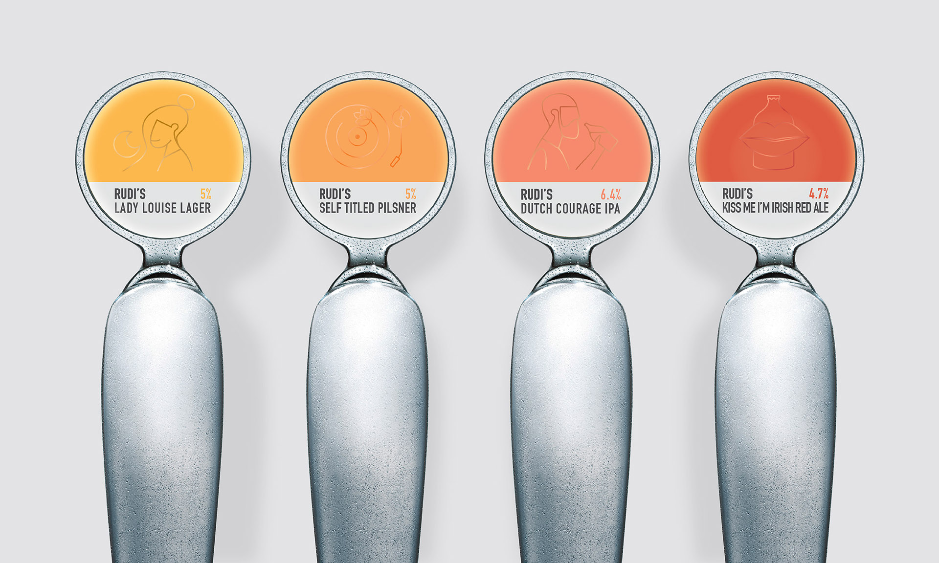 這是新西蘭的啤酒品牌Rudi's Beers包裝設計以紅、黃、橘三個暖色為主,傳達一種喝啤酒時的開心歡樂的情緒,再搭配鋁罐的金屬質地來呈現啤酒的濃郁醇厚,結合插畫的形式創造了一款獨特個性的包裝設計,在競爭激烈的精良啤酒市場中清晰的區分了他們的品牌。